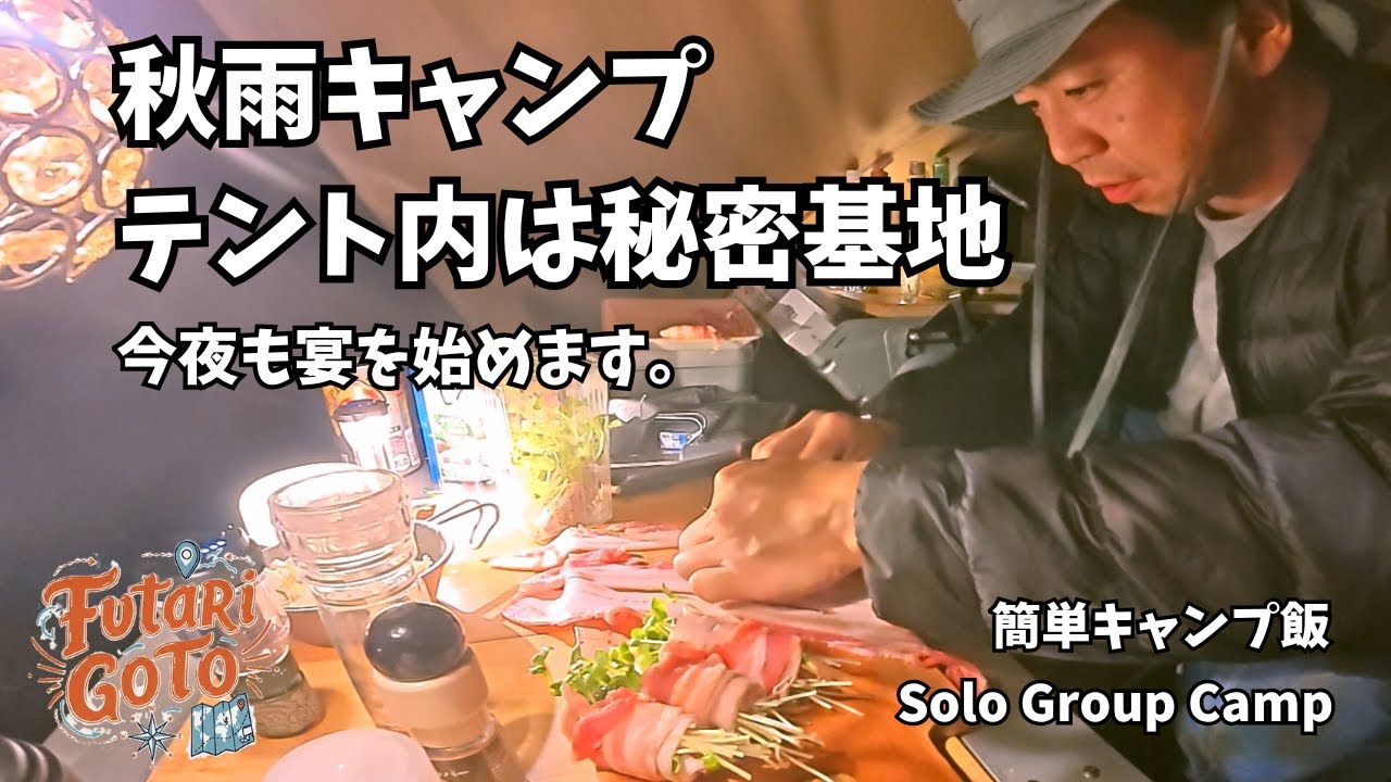 | タイトル | 【ソロキャンプ】雨キャンプ、テントの中はまるで秘密基地。|今夜も静かに宴を始めます|仲間と行くソログルキャン|簡単キャンプ飯 |